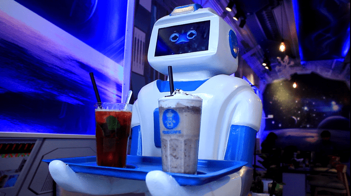 The robot is programmed to move along a metal line on the floor and bring drinks to the customers.