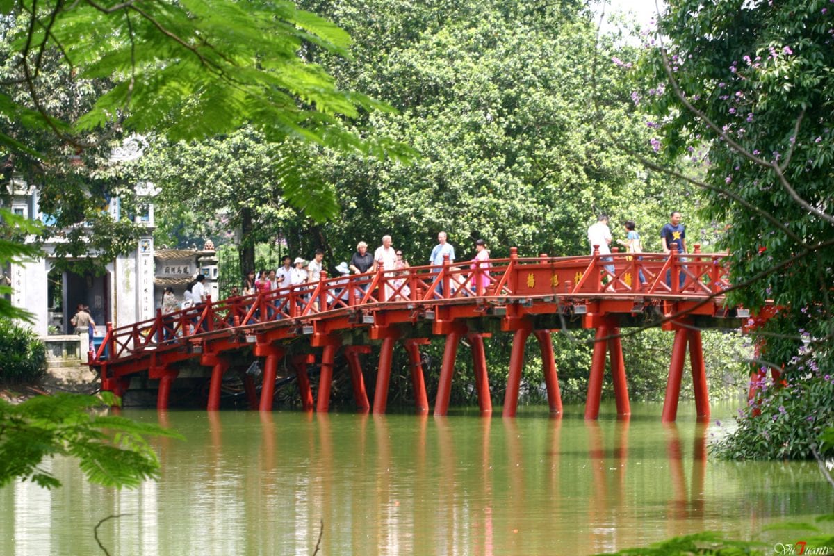 Tourists stand on “The Huc” Bridge, which leads to Ngoc Son Temple on Hoan Kiem Lake in Hanoi