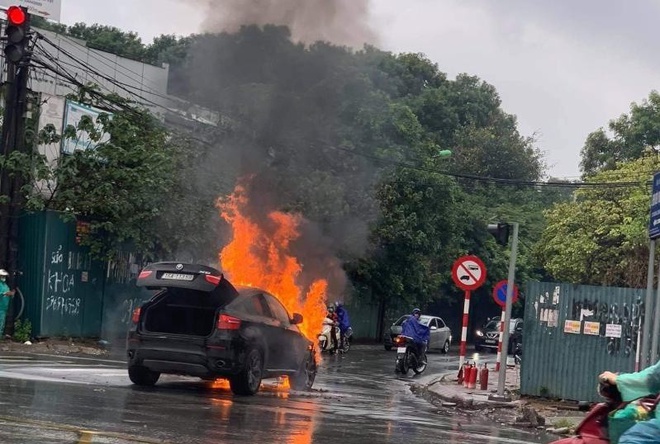 Around 10:30 a.m. on May 17, a BMW-branded automobile with the license plate 29A-781.XX was driving down Huynh Thuc Khang Street from Lang Ha to Nguyen Chi Thanh when it caught fire.
