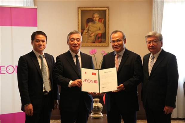 The AEON 1% Club Foundation under Japan’s AEON Co. presented 5 million JPY (46,000 USD) to Vietnamese Ambassador to Japan Vu Hong Nam on June 30 in support of Vietnamese students and practitioners hurt by the COVID-19 pandemic.