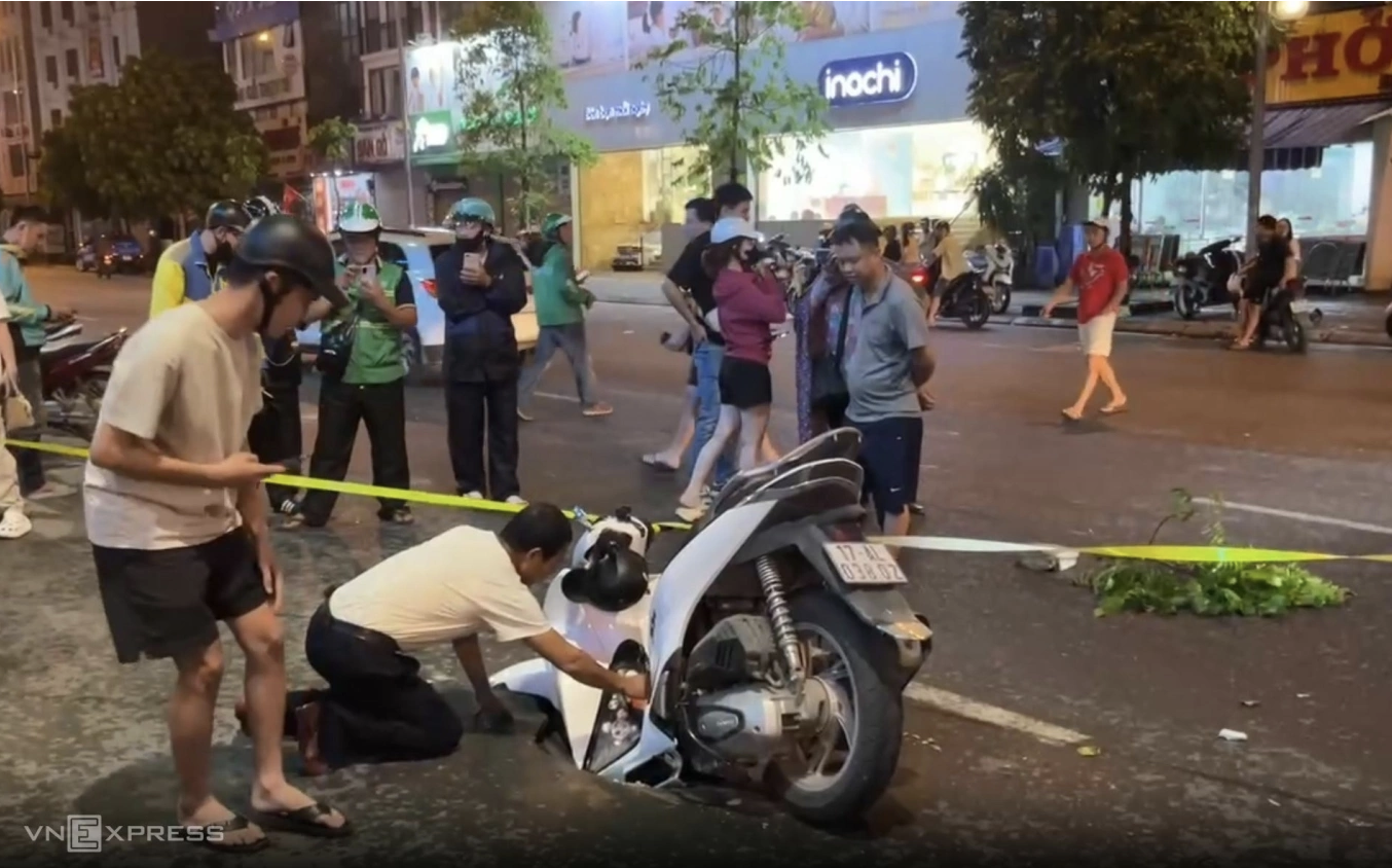 At around 9pm on July 26, a man was riding a SH motorbike on Truong Chinh Street towards Nga Tu So, old Dong Da District. When approaching the Ton That Tung – Truong Chinh intersection, the front wheel of the motorbike fell into a deep hole, the driver fell onto the road, suffering minor scratches.