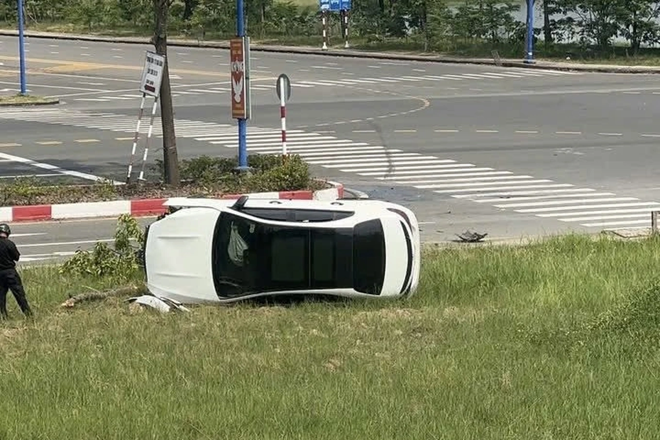 A Mercedes vehicle overturned after crashing into a roadside tree inside an industrial zone in Ho Chi Minh City, prompting an ongoing investigation by local authorities.