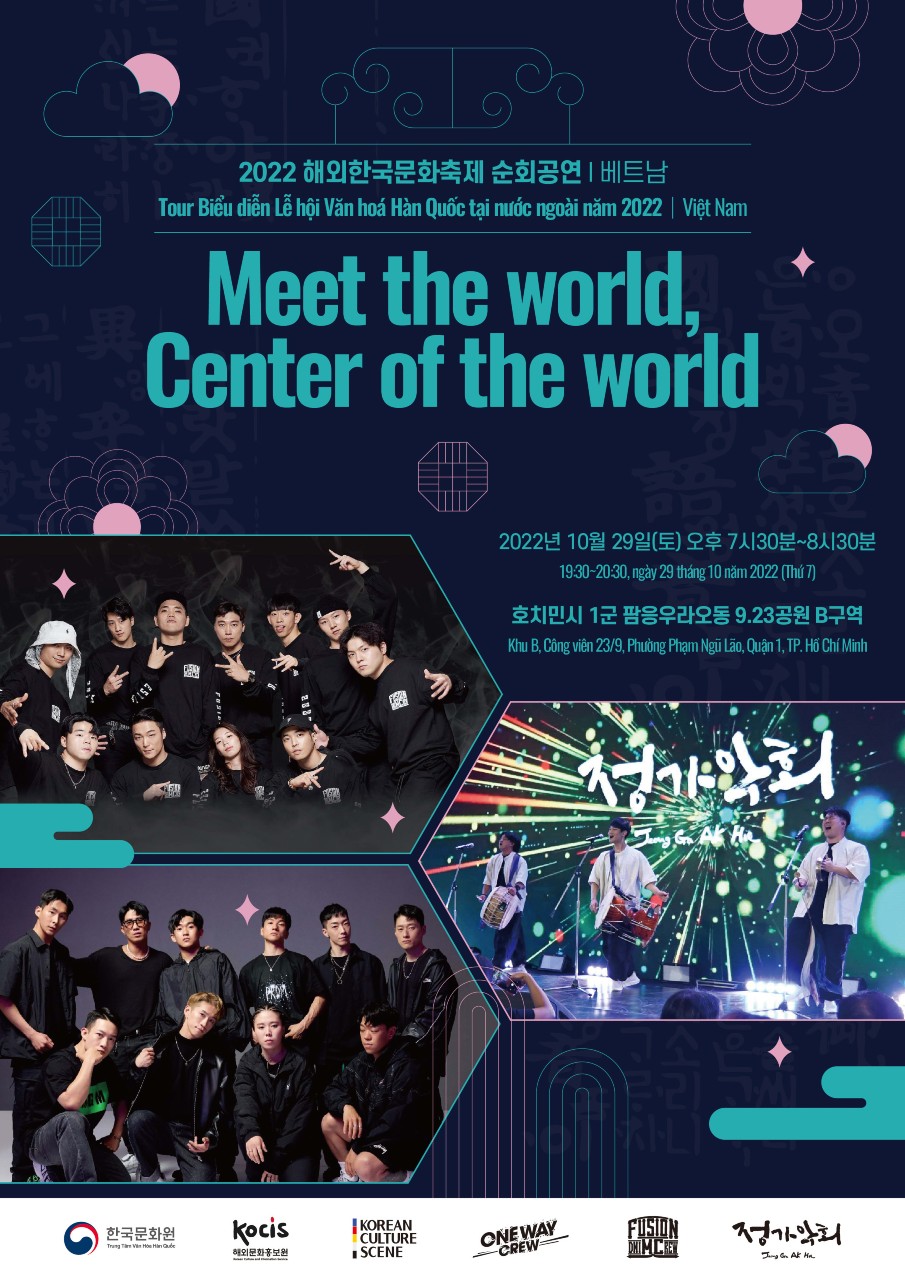 Đặc biệt, 7 giờ tối ngày 29 sẽ có chương trình biểu diễn nhạc cụ truyền thống kết hợp với K-breaking mang tên “Meet the World, Center of the World”. Đây là tour diễn của Lễ hội văn hóa Hàn Quốc ở nước ngoài năm 2022 Korean Culture Scene. Trong buổi biểu diễn kéo dài khoảng 60 phút này, nhóm B-boy hàng đầu Hàn Quốc là “Fusion MC” và “Oneway Crew” cùng với dàn nhạc truyền thống Hàn Quốc mang phong cách tự do “Jeong Ga Ak Hoe” bằng những nhạc cụ truyền thống sẽ tạo ra những nhịp điệu phá cách, đó sẽ là một buổi trình diễn đan xen kết hợp giữa nhạc cụ truyền thống và sự sôi động của điệu nhảy đường phố breaking và chỉ có thể thấy ở Hàn Quốc.