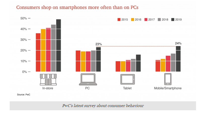 For the first time in the 10 years that PwC has conducted this survey, consumers surveyed are using smartphones over other mobile devices to shop online, with 24 per cent of consumers using a smartphone to shop online weekly.