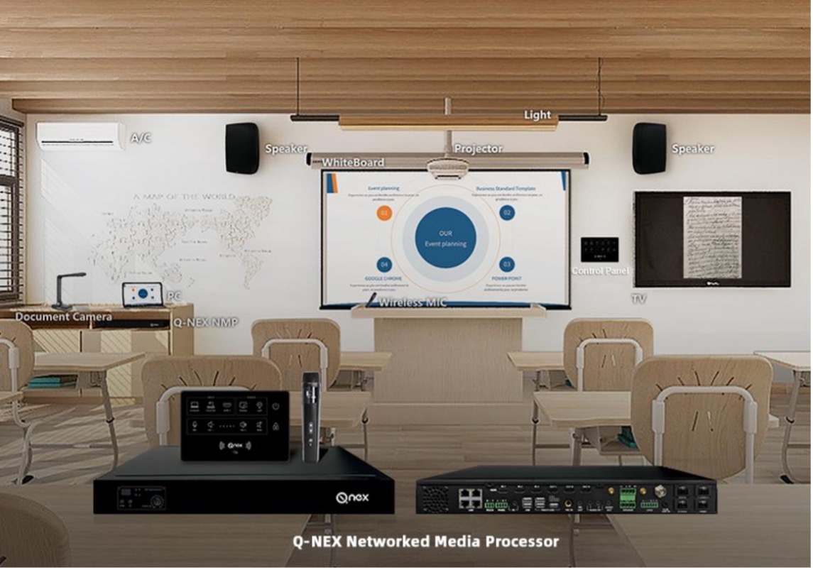 Q-NEX aims at solving these problems by a Networked Media Processor. It’s a highly-integrated equipment designed for classroom devices centralized control, AV distribution over IP and live streaming on a unified platform. Using the school’s existing network, Q-NEX offers IT admin remote management over the whole campus through web or App anytime and anywhere.