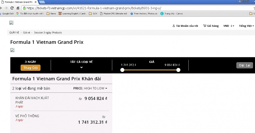 The cheapest is the Walkaround Ticket at $75 (VND1.7 million), while the Grandstand Ticket goes for $390 (VND8.97 million).