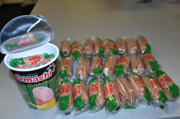 Agents then determined that the lids on all 25 cups of noodles had been opened, emptied, and stuffed with illegal pork sausage.